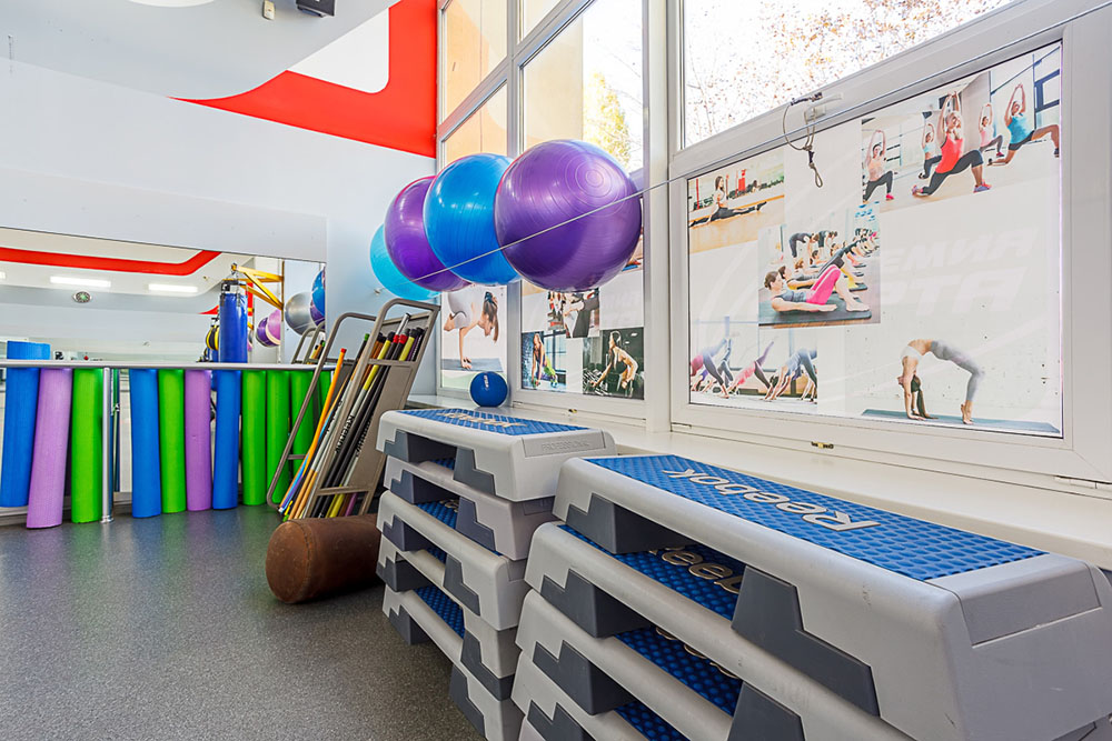 • спецобладнанням для тренувань: килимки для фітнесу, гантелі, степ-платформи, роли для пілатесу, ізотонічні кільця, еспандери, фітболи, бодібари, боксерські груші різних типів;